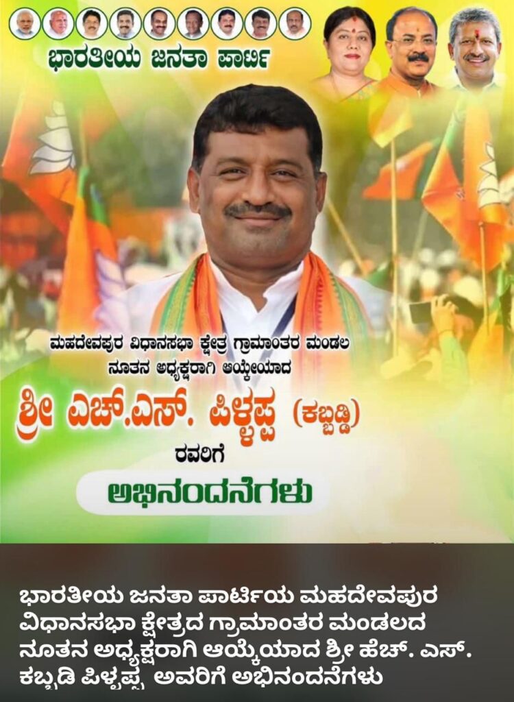 ಭಾರತೀಯ ಜನತಾ ಪಾರ್ಟಿಯ ಮಹದೇವಪುರ ವಿಧಾನಸಭಾ ಕ್ಷೇತ್ರದ ಗ್ರಾಮಾಂತರ ಮಂಡಲದ ನೂತನ ಅಧ್ಯಕ್ಷರಾಗಿ ಆಯ್ಕೆಯಾದ ಶ್ರೀ ಹೆಚ್. ಎಸ್. ಪಿಳ್ಳಪ್ಪ (ಕಬ್ಬಡಿ) ಅವರಿಗೆ ಅಭಿನಂದನೆಗಳು.