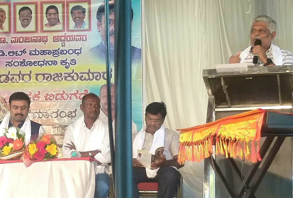 ಯಲಹಂಕ ಕ್ಷೇತ್ರದ ಕಾಕೋಳು ಗ್ರಾಮದ ಖಾಸಗಿ ರೆಸಾರ್ಟ್ ನಲ್ಲಿ ಭಾನುವಾರ ಆಯೋಜಿಸಿದ್ದ ಡಾ.ಮಂಜುನಾಥ ಅದ್ದೆ ಅವರು ಡಿ.ಲಿಟ್. ಪದವಿಗಾಗಿ ರಚಿಸಿದ್ದ ಸಂಶೋಧನಾ ಲೇಖನ ‘ಬಡವರ ರಾಜಕುಮಾರ’ ಕೃತಿ ಬಿಡುಗಡೆ ಮಾಡಿದ ನಂತರ ಮಾತನಾಡಿದ ಅವರು ‘ರಾಜಕುಮಾರ್ ಅವರು ಹೆಚ್ಚು ಓದದಿದ್ದರೂ ಅನುಭವದ ಆಧಾರದ ಮೇಲೆ ಸಮಾಜದ ಓರೆಕೋರೆಗಳು, ವರ್ಗ, ಜಾತಿ ಸಂಘರ್ಷದಂತಹ ಗಹನ ವಿಷಯಗಳನ್ನು ಆಳವಾಗಿ ಅರಿತಿದ್ದರು. ಅವರು ತಮ್ಮ ಬಹುತೇಕ ಚಿತ್ರಗಳಲ್ಲಿ ಅಸಮಾನತೆ, ಅನಾದರತೆ, ಅಸಹಜತೆಗಳ ವಿರುದ್ಧ ಸಿಡಿದೇಳುವ ಪಾತ್ರಗಳನ್ನು ನಿರ್ವಹಿಸುವ ಮೂಲಕ ಧ್ವನಿಯಿಲ್ಲದ ಅಸಂಖ್ಯಾತ ಬಡವರಿಗೆ ನಾಯಕ ಎನಿಸಿದ್ದರು. ಕೇವಲ ಪಾತ್ರಗಳಲ್ಲದೆ ನಿಜ ಜೀವನದಲ್ಲಿಯೂ ಸಹ ಸಮಾಜಕ್ಕೆ ಕಿಂಚಿತ್ತೂ ಕೆಡುಕಾಗದಂತೆ ಅತ್ಯಂತ ಕಾಳಜಿಯ ಬದುಕು ನಡೆಸುವ ಮೂಲಕ ಸಮಾಜಕ್ಕೆ ನಾಯಕ ಹೇಗಿರಬೇಕು ಎಂಬುದನ್ನು ನಿರೂಪಿಸಿ ರಾಜ್ಯದ ಅಸಂಖ್ಯಾತ ಅಭಿಮಾನಿಗಳಿಗೆ ಆದರ್ಶಪ್ರಾಯ ನಾಯಕ ಎನಿಸಿದ್ದಾರೆ. ಅವರು ಅಭಿನಯಿಸಿರುವ ಭಕ್ತ ಕುಂಬಾರ, ಭಕ್ತಕನಕದಾಸ, ಗಿರಿಕನ್ಯೆ ಸೇರಿದಂತೆ ಹಲವು ಚಿತ್ರಗಳು ತಳಸಮುದಾಯದ ನಾಯಕತ್ವವನ್ನು ಪ್ರತಿನಿಧಿಸಿವೆ. ಚಿತ್ರನಟನ ಹೊರತಾಗಿ ರಾಜ್ ಕುಮಾರ್ ಅವರು ಪ್ರಜಾತಂತ್ರದ ಸವಾಲುಗಳು, ಗೋಕಾಕ್ ಚಳವಳಿಯಂತಹ ಕನ್ನಡ ಭಾಷಾ ಚಳವಳಿಗಳಲ್ಲಿ ಪಾಲ್ಗೊಳ್ಳುವ ಮೂಲಕ ಅಪ್ರತಿಮ ಚಳವಳಿಗಾರನಾಗಿ ಸಹ ತಮ್ಮನ್ನು ಅಭಿವ್ಯಕ್ತಗೊಳಿಸಿದ್ದಾರೆ. ಅವರ ‘ಬಂಗಾರದ ಮನುಷ್ಯ’ ಚಲನಚಿತ್ರ ರಾಜ್ಯದಲ್ಲಿ ಅಸಂಖ್ಯಾತ ಜನರನ್ನು ಮಾದರಿ ಕೃಷಿಕರನ್ನಾಗಿ ಮಾಡುವಲ್ಲಿ ಯಶಸ್ವಿಯಾಗಿದೆ. ಅವರು ಜೀವಮಾನದಲ್ಲಿ ಅಭಿನಯಿಸಿದ ಪ್ರತಿ ಚಿತ್ರಗಳಲ್ಲೂ ಸಮಾಜಕ್ಕೆ ಸತ್ ಸಂದೇಶ ನೀಡಿದ್ದಾರೆ.