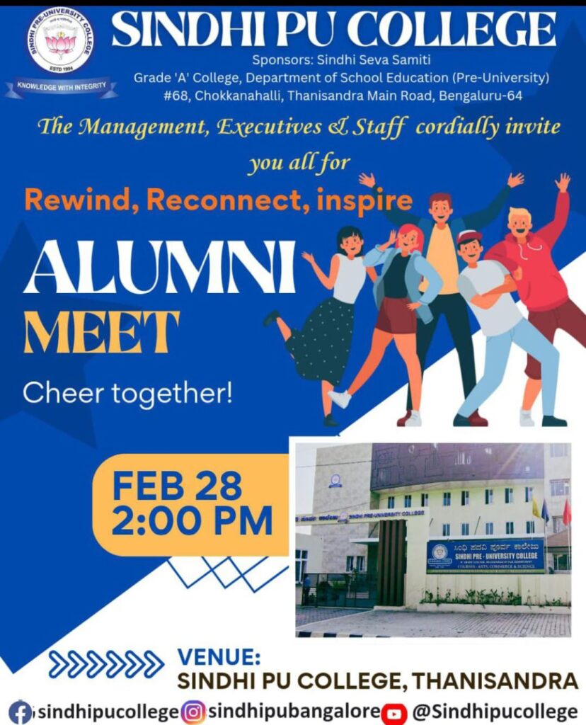 ದಿನಾಂಕ 28.02.2026ರಂದು ಥಣಿಸಂದ್ರ ಮುಖ್ಯ ರಸ್ತೆಯಲ್ಲಿರುವ ಸಿಂಧಿ ಪದವಿಪೂರ್ವ ಕಾಲೇಜಿನಲ್ಲಿ ಮಧ್ಯಾಹ್ನ 2 ಗಂಟೆಗೆ ಹಳೆಯ ವಿದ್ಯಾರ್ಥಿಗಳ ಸ್ನೇಹ ಮಿಲನ ಸಮಾರಂಭ ನಡೆಯಲಿದೆ ಎಂದು ಕಾಲೇಜಿನ ಪ್ರಾಂಶುಪಾಲರಾದ ಡಾ ನಂದ ಎನ್ ಅವರು ತಿಳಿಸಿದ್ದಾರೆ. ಸಮಾರಂಭದ ಅಧ್ಯಕ್ಷತೆಯನ್ನು ಸಿಂಧಿ ಸೇವಾ ಸಮಿತಿಯ ಅಧ್ಯಕ್ಷರಾದ ಶ್ರೀ ಪ್ರಕಾಶ್ ಎಫ್ ಮಾಧ್ವಾನಿಯವರು ವಹಿಸಲಿದ್ದಾರೆ. ಸಿಂಧಿ ಪದವಿಪೂರ್ವ ಕಾಲೇಜಿನ ಆಡಳಿತ ಮಂಡಳಿಯ ಅಧ್ಯಕ್ಷರಾದ ಶ್ರೀ ಅಶೋಕ್ ಪಿ ನಾರಂಗ್ ಅವರು ಹಾಗೂ ಕಾಲೇಜಿನ ಎಲ್ಲಾ ಪದಾಧಿಕಾರಿಗಳು ಉಪಸ್ಥಿತರಿರುತ್ತಾರೆ. ಸಮಾರಂಭವು ಹಳೆಯ ವಿದ್ಯಾರ್ಥಿ ಕೂಟದ ಉದ್ಘಾಟನೆಯೊಂದಿಗೆ ಆರಂಭವಾಗಿ ಪ್ರಾಂಶುಪಾಲರ ಪ್ರಾಸ್ತಾವಿಕ ಭಾಷಣ, ಹಳೆಯ ವಿದ್ಯಾರ್ಥಿಗಳ ಕಾಲೇಜಿನ ಸವಿ ನೆನಪಿನ ಚರ್ಚೆ, ಕಾಲೇಜಿನ ಉನ್ನತಿಗೆ ಸಲಹೆ ಸೂಚನೆಗಳ ಜೊತೆಗೆ ಸಾಂಸ್ಕೃತಿಕ ಕಾರ್ಯಕ್ರಮಗಳು ನಡೆಯಲಿವೆ.