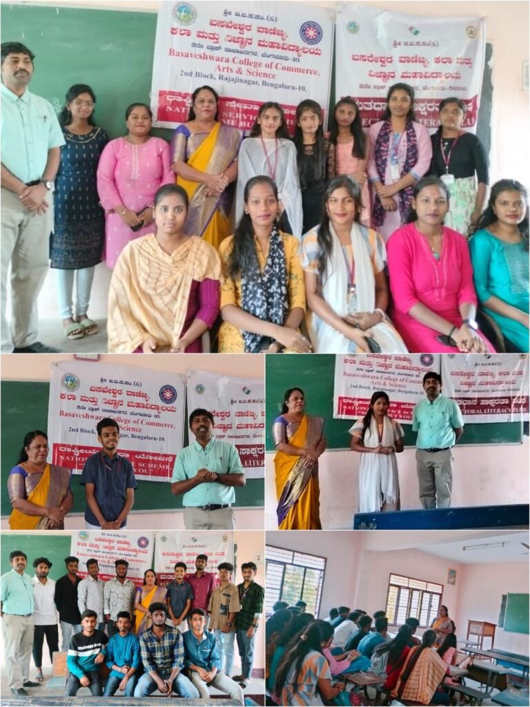 ದಿನಾಂಕ 7-3-2024 ಗುರುವಾರ ಹಾಗೂ 8, 3, 2024 ಶುಕ್ರವಾರ 12.30 ಗಂಟೆಗೆ ಬಸವೇಶ್ವರ ವಾಣಿಜ್ಯಕಲಾ ವಿಜ್ಞಾನ ಮಹಾವಿದ್ಯಾಲಯರಾಜಾಜಿನಗರದ ಮತದಾನ ಸಾಕ್ಷರತೆ ಸಂಘ ಹಾಗೂ ಎನ್ ಎಸ್ಎಸ್ ಸಹಯೋಗದಲ್ಲಿ ಮಹಿಳಾ ದಿನಾಚರಣೆಯ ವಿಶೇಷ ಎರಡು ದಿನಗಳ ಕಾರ್ಯಕ್ರಮದಲ್ಲಿ ಮಹಿಳೆಯರಿಗೆ ಮತದಾನದ ಮಹತ್ವ – ನೋಂದಣಿ ಪ್ರಕ್ರಿಯೆ ಮತ ಚಲಾವಣೆಯ ಬಗ್ಗೆ ಜಾಗ್ರತಿ ಮಾಡಿಸುವ ಕಾರ್ಯಕ್ರಮ ಹಮ್ಮಿಕೊಳ್ಳಲಾಗಿತ್ತು. 7-3, 2024ರಂದು ವಿದ್ಯಾರ್ಥಿ ವಿದ್ಯಾರ್ಥಿನಿಯರಿಗೆ ಅರಿವು ಮಾಡಿಸುವ ತರಬೇತಿ ನೀಡಲಾಯ್ತು. ಎನ್ಎಸ್ಎಸ್ ಅಧಿಕಾರಿ ಶ್ರೀಗಿರೀಶ ವೈ ಮತದಾನದ ಸಂದರ್ಭದಲ್ಲಿ, ಮಹಿಳೆಯರು ತಮ್ಮಲ್ಲಿ ಕಡ್ಡಾಯ ವಾಗಿ ವೋಟರ್ ಐ ಡಿ ಇರಬೇಕಾಗಿರುವುದರ ಮಹತ್ವವನ್ನು ಹೇಗೆ ತಿಳಿಸಬೇಕೆಂದು ತರಬೇತಿ ನೀಡಿದರು. 8, 3, 2024 ಶುಕ್ರವಾರದಂದು ತರಬೇತಿ ಪಡೆದ ವಿದ್ಯಾರ್ಥಿಗಳು ಹೆಚ್ಚು ಮಹಿಳೆಯರಿದ್ದ ಸಮಾರಂಭದಲ್ಲಿ ಭಾಗವಹಿಸಿ ಮತದಾನದ ಹಕ್ಕು ಮತ್ತು ಕರ್ತವ್ಯದ ಬಗ್ಗೆ ಅರಿವು ಮಾಡಿಸಿರುತ್ತಾರೆ. ಪ್ರಾಂಶುಪಾಲರಾದ ಡಾ. ಶೀಲಾದೇವಿ ಎಸ್.ಮಳೀಮಠರವರು ತರಬೇತಿಯನ್ನು ಉದ್ಘಾಟಿಸಿ ಮತದಾನದ ಮಹತ್ವವನ್ನು ಹೆಚ್ಚಿನ ಸಂಖ್ಯೆಯಲ್ಲಿ ಅರಿವು ಮಾಡಿಸಿ ದತ್ತಾಂಶ ಸಂಗ್ರಹಿಸಿ ಎಂದು ಕರೆಕೊಟ್ಟರು. ಮತದಾನ ಸಾಕ್ಷರತಾ ಸಂಘ ಹಾಗೂ ಎನ್ಎಸ್ಎಸ್ ಘಟಕದ ಈ ಕಾರ್ಯಕ್ರಮದಲ್ಲಿ ಭಾಗವಹಿಸಿದ ಅಧ್ಯಾಪಕರು ಹಾಗೂ ವಿದ್ಯಾರ್ಥಿಗಳು ತರಬೇತಿಯೊಂದಿಗೆ ವಿಚಾರ ವಿನಿಮಯವನ್ನು ಯಶಸ್ವಿಗೊಳಿಸಿದ್ದು ಪರಿಣಾಮದಾಯಕವಾಗಿತ್ತು.