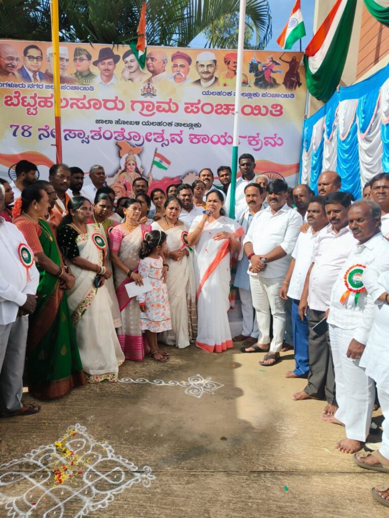 ಬ್ಯಾಟರಾಯನಪುರ : 78ನೇ ಸ್ವಾತಂತ್ರ್ಯ ದಿನಾಚರಣೆಯ ಅಂಗವಾಗಿ ಬ್ಯಾಟರಾಯನಪುರ ಕ್ಷೇತ್ರದ ಬೆಟ್ಟಹಲಸೂರು ಗ್ರಾ.ಪಂ. ವತಿಯಿಂದ ಏರ್ಪಡಿಸಿದ್ದ ಕಾರ್ಯ ಕ್ರಮದಲ್ಲಿ ಕೇಂದ್ರ ಸಚಿವೆ ಶೋಭಾ ಕರಂದ್ಲಾಜೆ ಪಾಲ್ಗೊಂಡು ಧ್ವಜಾರೋಹಣ ನೆರವೇರಿಸಿದರು.